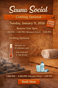 Clothing-optional doesn’t mean anything other than personal comfort — the event is non-sexual and designed to be respectful and safe for everyone. Please bring a towel to sit on while in the sauna for hygiene, and always respect others’ space and consent.